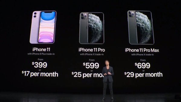 iPhone 11 Pro va costa 999 dolari, iar iPhone 11 Pro Max va costa 1.099 dolari. Data de lansare este stabilită pentru 20 septembrie. iPhone XR va rămâne în ofertă la 599 dolari, iar iPhone 8 rămâne la 449 dolari.
