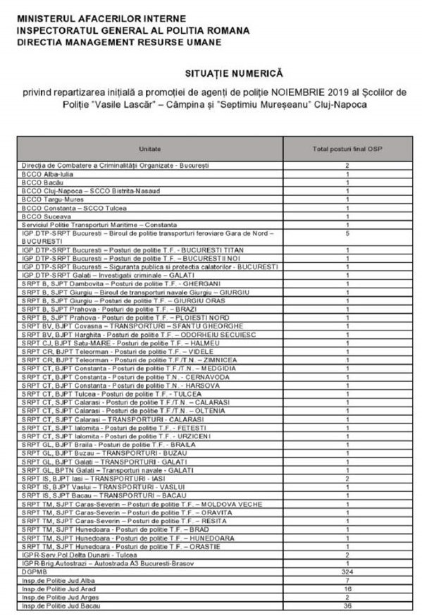 Ministerul Afacerilor Interne a repartizat 1.311 locuri la nivelul inspectoratelor judeţene de poliţie pentru tinerii absolvenţi ai promoţiei noiembrie 2019 din cadrul şcolilor de poliţie „Vasile Lascăr” dn Câmpina şi „Septimiu Mureşa” din Cluj-Napoca.
