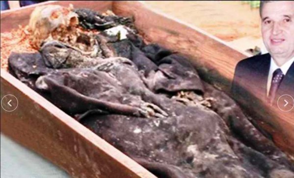 În imagini se vede scheletul dictatorului, îmbrăcat în paltonul în care a fost executat, în urmă cu 30 de ani.